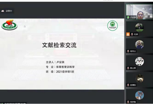为进一步丰富疫情封控期间学习生活,促进员工间相互交流,营造更加浓郁的学术氛围,体训公司研究生于3月31日19:00举办第一次线上学术沙龙活动,主讲人为21级体训学硕一班卢安琪同学,主题是“文献检索交流”,近130位员工观看学习,并进行交流讨论。