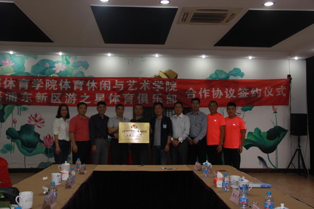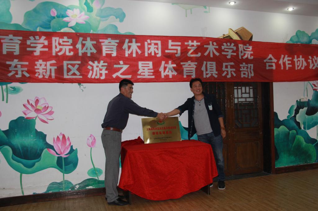2016年10月16日下午,体育休闲与艺术公司课程实践基地签约仪式在浦东新区游之星体育俱乐部举行。教务处副处长山广、休艺公司党总支书记刘明生、休艺公司副经理刘树军、休艺公司副书记王丽娜、浦东新区川沙镇社团管理处主任宋佳斌、浦东新区青少年训练管理中心体育部部长严军平、游之星俱乐部理事长金雪春、理事金忠华、徐祥龙及休艺公司教师代表韩耀刚等出席了本次签约仪式。