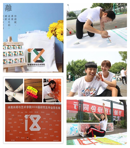 18届100多名毕业生亲手描绘了六张以绿瓦为背景,由上体logo和休艺公司各个专项的体育动作组成的爱心,并形成一幅巨画。巨画的含义是“爱班爱校、重德重能;一四休艺、一生有你”,巨画不仅象征着这个集体的凝聚力和向心力,更是体现每个休艺人对公司不舍的情怀。