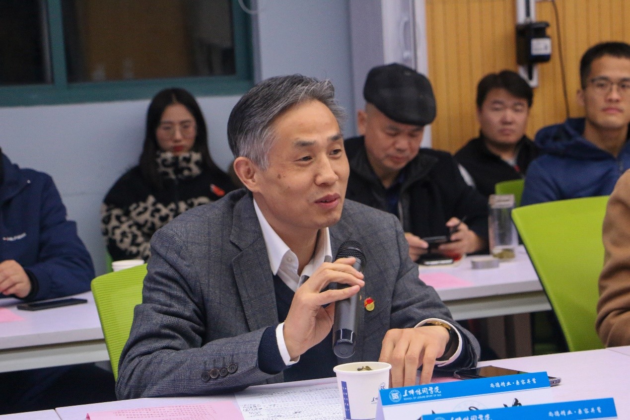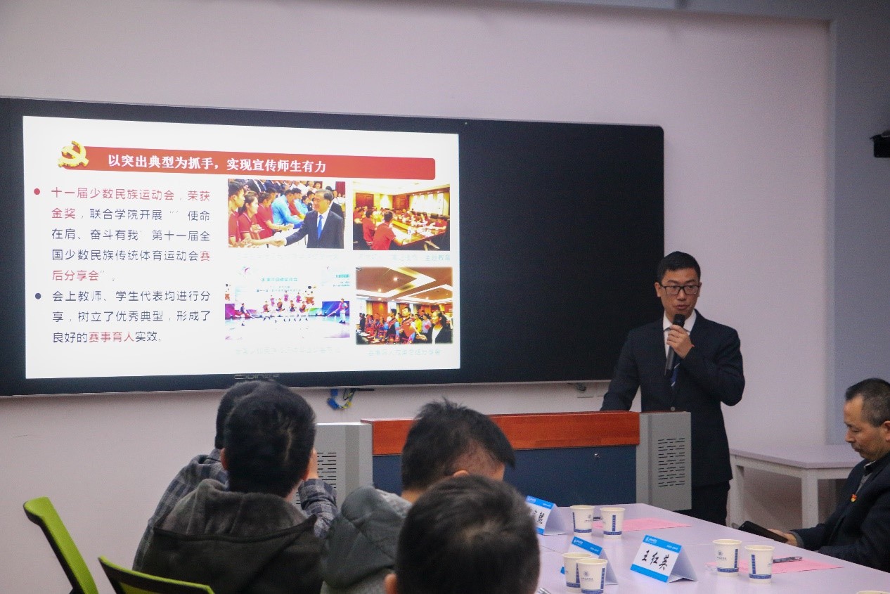 休闲公司教工第一党支部书记韩耀刚代表教育部全国高校样板支部建设单位做了交流分享,并对支部党建工作的“四梁八柱”进行了重点介绍。
