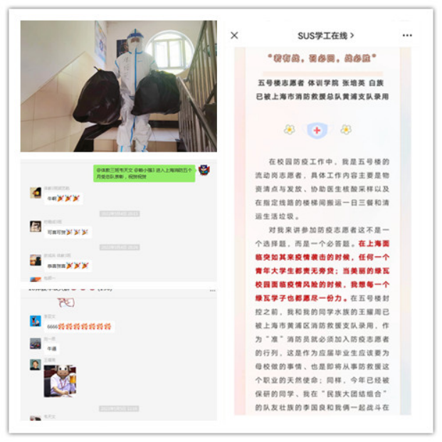 两位受表彰同学的事迹在毕业年级引起强烈反响,极大地提升了同学们积极投身抗疫志愿服务的热情,极大地鼓舞大家克服困难努力求职的信心。因受疫情影响暂未入职报到的新录用消防员张培英、王耀周、刘瑞瑞、郑泽伟等一大批同学积极加入志愿者行列,吃苦在前、冲锋在前,受到了所在楼栋领导老师和同学的一致好评。