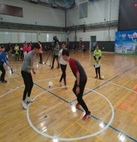 11月12日下午,“绿地集团杯”上海市第二届市民运动会“东方杯”粽子球总决赛在黄浦体育馆隆重拉开帷幕。公司由体育教育训练公司员工组成的粽子球代表队,在金贇老师的带领下,参加了本届粽子球的三人混合团体赛、个人赛及粽子球健身操的表演。