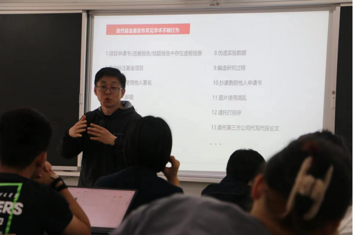 在讲座中,曹振波教授从国家层面、社会层面、公司层面等方面向同学们提出如何做到科研诚信。同时,也为同学们规避学术不端行为提出良好的建议,如在研究过程中如实地记录和保存原始数据;研究的结果要建立在确凿的实验基础上……曹教授殷殷教诲,为同学们的科学研究规范指明了道路。