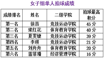本次比赛采用线上推送、线下比赛现场相结合的报名方式,根据最终报名人数随机分成三组同时进行单项拍球赛。每位参赛选手有三次拍球机会,取个人最高成绩,如果遇到最高成绩相同,则取次成绩,以此类推,次数多者为胜。本次比赛还增加了三人接力挑战赛,队伍人员由参加个人赛的同学自由组合搭档,男女不限,上场参赛队员在拍球接力循环过程中,每人最多拍两次球机会,直至中断,取三次接力拍球的累积总成绩,是一项十分考验拍球技能和团队默契的赛事。