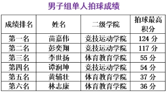 活动开始,首先由金贇老师宣读比赛规程和特殊注意事项。正赛伊始,参赛选手现在规定场区有序的进行热身与试拍,场序较前的运动员拍球动作还略显生疏,似乎还未找到拍球的诀窍,大家的成绩都在30分以内。随着比赛的推进,选手们也渐入佳境,找到了拍球的感觉,突破了之前的30分大关。男子组获得117分成绩的彭奕翔一直保持领先,但最后出场的苗嘉伟同学后来居上,以124分的高分绝地反超,最终来自竞技运动公司的两位同学以巨大的积分优势分获冠、亚军。女子组同样是来自竞技运动公司的徐蕊同学以45分勇夺桂冠。而接力拍球挑战赛由默契度更高的永利yl23411的李世扬、黄辅壮、张时纶三位同学拔得头筹,累积59分,三人展现了良好的身体协调能力与团队协作意识。