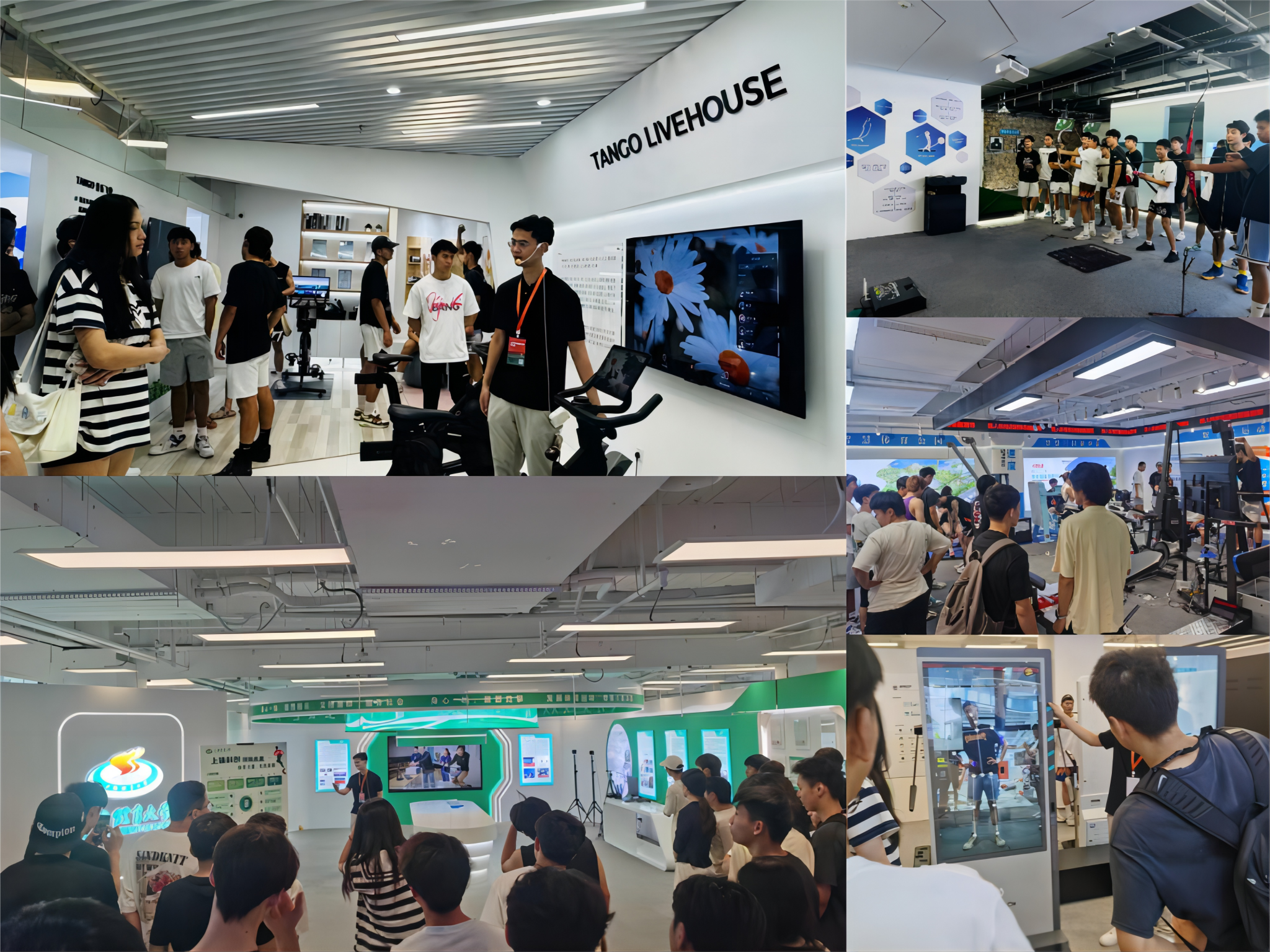 随后,师生们参观了位于海尚园区的体育产业创新中心,调研了众多体育细分赛道优秀企业。上体科技园体育产业创新中心被誉为“永不落幕的体博会”,全方位地展示了中国多个体育场景中领先的技术、产品和经营模式。在园区工作人员的专业介绍下,同学们现场体验了AI+、VR+体育产品,真切感受了体育赛道科技创新的魅力。