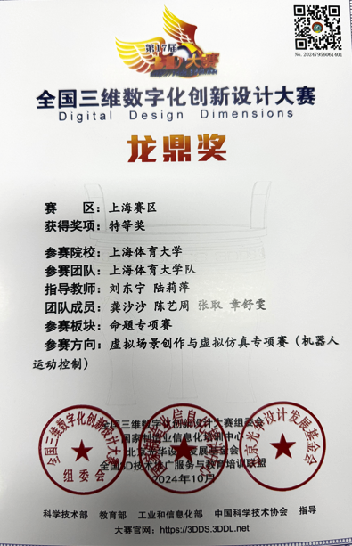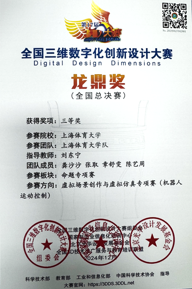 2024年12月8日,第17届全国三维数字化创新设计大赛年度总决赛在北京理工大学圆满落幕,永利yl23411派出了由休闲体育与社会体育指导与管理专业师生组成的户外运动代表队参加了本次赛事,公司作为参赛院校中唯一的体育类高校与全国各地理工类高校同台竞技,最终在“虚拟场景创作与虚拟仿真—机器人运动控制方向专项赛”中获得上海分赛区特等奖,获得全国总决赛三等奖,实现了公司在该项赛事的历史性突破。