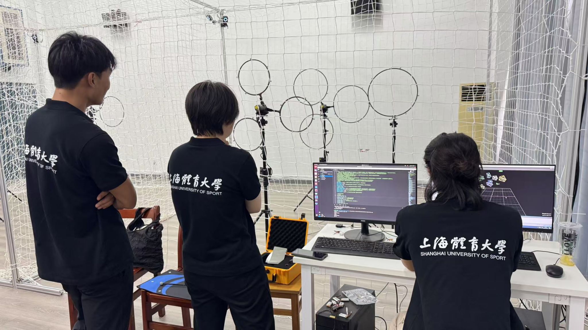 公司户外运动代表队曾在2023年获得AOPA华东无人机职业应用技能大赛冠军,在无人机操控方面积累了较为丰富的经验,本次比赛由刘东宁、陆莉萍担任指导老师,由社会体育指导与管理专业研究生龚沙沙、章舒雯,休闲体育本科户外运动专项班张取、陈艺周等四位同学组成代表队。参加的机器人运动控制方向主要为无人机穿越,比赛在尺寸大小为长4米*宽4米*高2.8米全包围场地中。竞赛内容包括设备调试、自主飞行、穿越障碍环三个部分。员工进行自主操作动捕系统,完成动捕校准,加载刚体、刚体调试,程序连接,设置参数,无人机飞行穿越障碍物并降落。队员们从零开始学习代码与编程知识,掌握动捕软件的使用技巧,苦练无人机操纵技术,在比赛中展现出坚忍不拔的顽强品质与刻苦钻研的学习精神。作为唯一的体育类参赛高校,队员们的优异表现受到了多方好评及关注,为公司争得了荣誉。