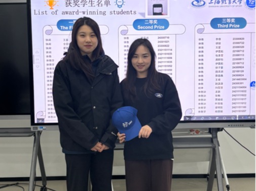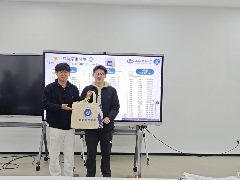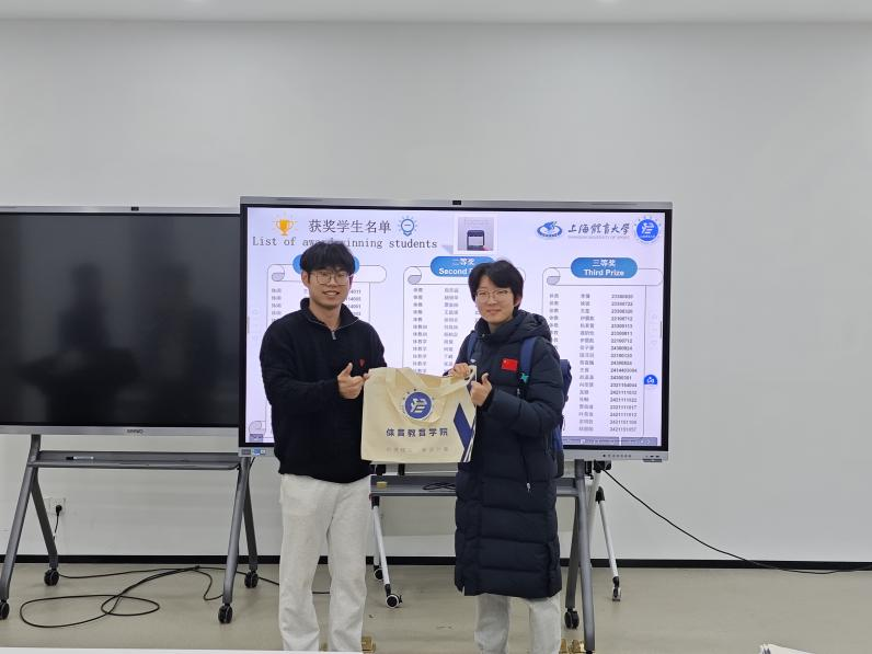 院研究生会主席团成员葛广慧、王宇琛及各部门负责人、副部长为获二、三等奖的同学颁发奖品。