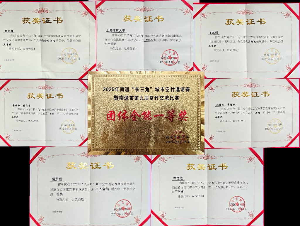 经过激烈角逐,上体空竹队凭借精湛技艺与默契配合斩获多项荣誉:集体获得社会组团体赛一等奖,屈景远斩获社会组个人全能一等奖,李佳欣、张传玺获竞技互抛社会组二等奖,蓝敬粡获竞速类高抛跳绳社会组二等奖,李佳欣获社会组个人全能三等奖,杨宏健获竞速类金龙绕腿社会组三等奖。
