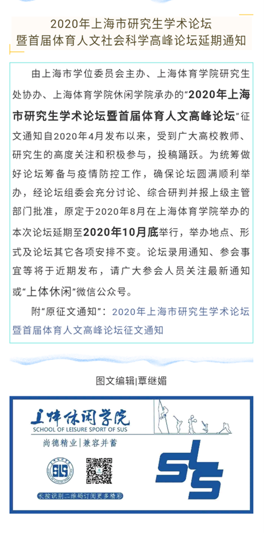 2020年上海市研究生学术论坛暨首届体育人文社会科学高峰论坛延期通知