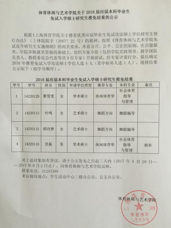 体育休闲与艺术公司关于2018届应届本科毕业生免试入学硕士研究生推免结果的公示