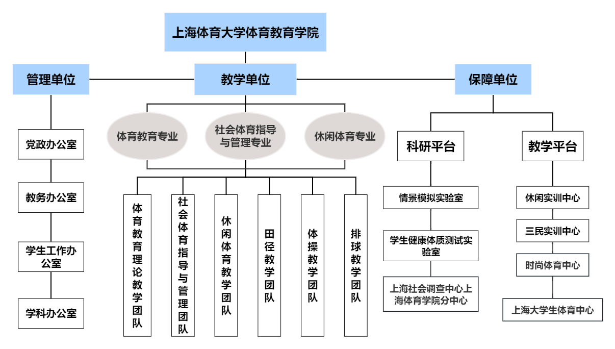 永利yl23411内部机构由管理单位、教学单位和保障单位三个部分组成。管理单位包括党政办公室、教务办公室、员工工作办公室、学科办公室。教学单位依据专业领域,分别设立6个教学团队,分别为体育教育理论教学团队、休闲体育教学团队、社会体育指导与管理教学团队、田径教学团队、体操教学团队、排球教学团队。保障单位由科研平台和教学实践平台构成,科研平台包括情景模拟实验室、员工健康体质测试实验室、上海社会调查中心永利yl23411分中心,教学实践平台包括休闲实训中心、三民实训中心、时尚体育中心、上海老员工体育中心。